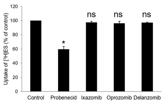 Cis-effect of ixazomib, oprozomib, or delanzomib on OAT3-mediated uptake of [3H]ES. The uptake of [3H]ES (250 nM) in the presence of ixazomib (1 μM), oprozomib (1 μM), delanzomib (1 μM), or probenecid (5 μM) for 3 min was measured in OAT3-expressing COS-7 cells. Each data point represented only carrier-mediated transport after subtraction of values from parental cells. Uptake activity was expressed as the percentage of uptake measured in control cells from three independent experiments. Values are means ± S.D. (n = 3). * p < 0.05; ns = not statistically significant.
