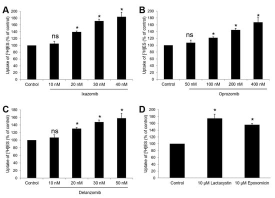 Effect of ixazomib, oprozomib, delanzomib, or classical proteasome inhibitors on OAT3 activity. OAT3-expressing COS-7 cells were treated with ixazomib (A), oprozomib (B), delanzomib (C), or classical proteasome inhibitors lactacystin or epoxomicin (D) at indicated concentrations for 6 h. The uptake of [3H]ES (250 nM) for 3 minu was then performed. Each data point represented only carrier-mediated transport after subtraction of values from parental cells. Uptake activity was expressed as the percentage of uptake measured in control cells from three independent experiments. Values are means ± S.D. (n = 3). * p < 0.05; ns = not statistically significant.