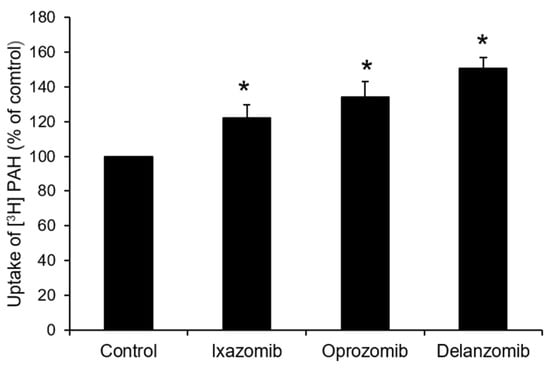 Effect of ixazomib, oprozomib, or delanzomib on OAT3-mediated transport of p-aminohippuric acid. OAT3-expressing COS-7 cells were treated with ixazomib (30 nM), oprozomib (200 nM), or delanzomib (30 nM) for 6 h. The uptake of [3H]PAH (20 µM) for 3 min was then performed. Each data point represented only carrier-mediated transport after subtraction of values from parental cells. Uptake activity was expressed as the percentage of uptake measured in control cells from three independent experiments. Values are means ± S.D. (n = 3). * p < 0.05.