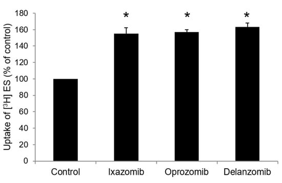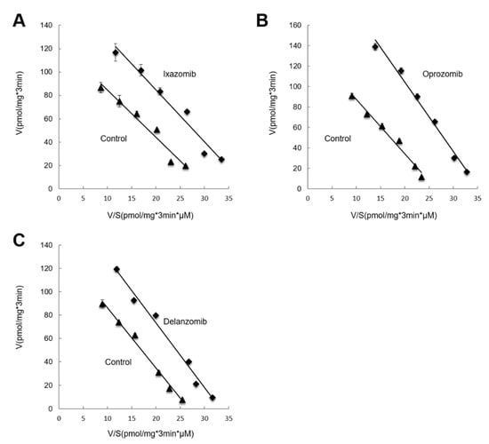 To examine the mechanism of ixazomib-, oprozomib-, and delanzomib-induced stimulation of OAT3 activity, we determined [3H]ES uptake at a series of concentrations (0.3~10 µM). Eadie–Hofstee analyses of the derived data (Figure 8) showed that incubation of ixazomib (Figure 8A), oprozomib (Figure 8B), or delanzomib (Figure 8C) resulted in an increased maximum transport velocity Vmax (128 ± 3 pmol·mg−1·3 min−1 with untreated cells and 176 ± 7 pmol·mg−1·3 min−1 in the presence of ixazomib; 130 ± 2 pmol·mg−1·3 min−1 with untreated cells and 223 ± 4 pmol·mg−1·3 min−1 in the presence of oprozomib; 128 ± 11 pmol·mg−1·3 min−1 with untreated cells and 175 ± 11 pmol·mg−1·3 min−1 in the presence of delanzomib), with no significant change of substrate-binding-affinity Km for ES (4.2 ± 0.3 μM with untreated cells and 4.6 ± 0.4 μM in the presence of ixazomib; 4.6 ± 0.1 μM with untreated cells and 6.0 ± 0.2 μM in the presence of oprozomib; 4.3 ± 0.9 μM with untreated cells and 4.9 ± 0.7 μM in the presence of delanzomib). These results indicated that stimulated activity of ixazomib, oprozomib, and delanzomib resulted from an increase of the transport rate of OAT3, and not from an enhanced affinity at the substrate-binding site.