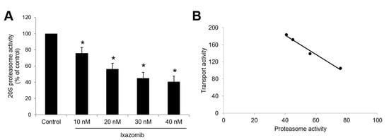 Dose-effect of ixazomib on the 20S proteasome activity. (A) OAT3-expressing COS-7 cells were treated with ixazomib at indicated concentrations for 6 h. The 20S proteasome activity of cells was then performed. The 20S proteasome activity was expressed as the percentage of control cells from three independent experiments. Values are means ± S.D. (n = 3). * p < 0.05. (B) Correlation analysis was performed between transport activity from Figure 4A and proteasomal activity from Figure 7A after ixazomib treatment.