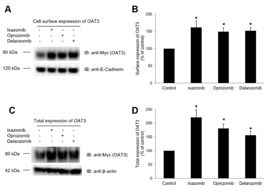 Effect of ixazomib, oprozomib, or delanzomib on OAT3 expression. (A) Top panel: OAT3-expressing COS-7 cells were treated with ixazomib (30 nM), oprozomib (200 nM), or delanzomib (30 nM) for 6 h. Cell-surface biotinylation was performed. Biotinylated (cell surface) proteins were separated with using streptavidin agarose resin and analyzed by IB with an anti-Myc antibody. Bottom panel: The same blot from the top panel was reprobed with an anti-E-Cadherin antibody. E-Cadherin is an integral membrane protein marker. (B) Densitometry plot of results from (A), top panel, as well as from other experiments. Values are means ± S.D. (n = 3). * p < 0.05. (C) Top panel: OAT3-expressing COS-7 cells were treated with ixazomib (30 nM), oprozomib (200 nM), or delanzomib (30 nM) for 6 h. Cells were then lysed, followed by IB with anti-Myc antibody. Bottom panel: The same blot from the top panel was reprobed with an anti-β-actin antibody. β-actin is a cellular protein marker. (D) Densitometry plot of results from (C), top panel, as well as from other experiments. Values are means ± S.D. (n = 3). * p < 0.05.