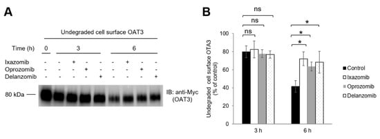 Effect of ixazomib, oprozomib, or delanzomib on OAT3 stability. (A) OAT3-expressing COS-7 cells were biotinylated with membrane-impermeable biotinylation reagent sulfo-NHS-SS-biotin. Labeled cells were then treated with ixazomib (30 nM), oprozomib (200 nM), or delanzomib (30 nM) at 37 °C for 3 and 6 h, respectively. Treated cells were lysed, and cell-surface proteins were isolated using streptavidin-agarose resin, followed by IB with anti-Myc antibody. (B) Densitometry plot of results from (A), as well as from other experiments. The amount of undegraded cell-surface hOAT3 was expressed as % of total initial cell-surface hOAT3 pool. Values are means ± S.D. (n = 3). * p < 0.05; ns = not statistically significant. Two-way ANOVA Tukey’s test was applied for statistical analysis.