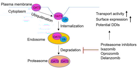 Oral proteasomal inhibitors ixazomib, oprozomib, and delanzomib upregulate the transport activity and expression of OAT3. Ub = ubiquitin; DDIs = drug–drug interactions.