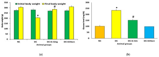(a) The initial and the final body weight of different groups of rats after 8 weeks of experimental design. The rats were equally divided into 4 groups, each group (n = 8). Data are represented as mean ± standard error of the mean (SEM). Groups: Normal control (NC); disease control (DC), i.e., STZ-treated group; treatment group (DC + 6-gingerol); positive control (PC) animal treated with STZ + glibenclamide; * p < 0.05 (significant difference of final b.w. between DC vs. NC) # p < 0.05 (significant difference of final b.w. between DC vs. DC + 6-gingerol). (b): The values of serum glucose in different groups of rats after 8 weeks of treatment. The rats were equally divided into 4 groups, each group (n = 8). Data are represented as mean ± standard error of the mean (SEM). Groups: Normal control (NC); disease control (DC), i.e., STZ-treated group; treatment group (DC + 6-gingerol); positive control (PC) animal treated with STZ + glibenclamide; * p < 0.05 (significant difference of final b.w. between DC vs. NC) # p < 0.05 (significant difference of final b.w. between DC vs. DC + 6-gingerol).