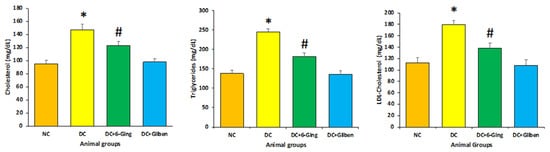 The lipid profile in different groups of rats after 8 weeks of continues treatment. The rats were equally divided into 4 groups, each group (n = 8). Data are presented as mean ± standard error of the mean (SEM). Groups: Normal control (NC); disease control (DC), i.e., STZ-treated group; treatment group (DC + 6-gingerol); positive control (PC) animal treated with STZ + glibenclamide; * p < 0.05 (significant difference of final b.w. between DC vs. NC) # p < 0.05 (significant difference of final b.w. between DC vs. DC + 6-gingerol).