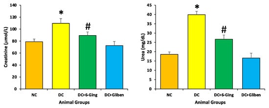 The kidney function test profile (creatinine and urea) in different groups of rats after 8 weeks of treatment. The rats were equally divided into 4 groups, each group (n = 8). Data are presented as mean ± standard error of the mean (SEM). Groups: Normal control (NC); disease control (DC), i.e., STZ-treated group; treatment group (DC + 6-gingerol); positive control (PC) animal treated with STZ + glibenclamide; * p < 0.05 (significant difference of final b.w. between DC vs. NC) # p < 0.05 (significant difference of final b.w. between DC vs. DC + 6-gingerol).