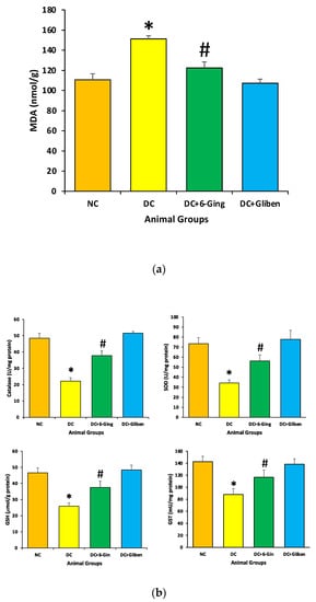 (a, b): The lipid peroxidation (MDA) and antioxidant enzyme (CAT, SOD, GST and GSH) level in different groups of rats after 8 weeks of treatment. The rats were equally divided into 4 groups, each group (sample size = 8). Data are shown as mean ± standard error of the mean (SEM). Groups: Normal control (NC); disease control (DC), i.e., STZ-treated group; treatment group (DC + 6-gingerol); positive control (PC) animal treated with STZ + glibenclamide; * p < 0.05 (significant difference of final b.w. between DC vs. NC) # p < 0.05 (significant difference of final b.w. between DC vs. DC + 6-gingerol).