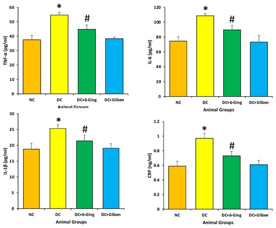 The inflammatory markers level in different groups of rats after 8 weeks of treatment. The rats were equally divided into 4 groups, each group (sample size = 8). Data are summarized as mean ± standard error of the mean (SEM). Groups: Normal control (NC); disease control (DC), i.e., STZ-treated group; treatment group (DC + 6-gingerol); positive control (PC) animal treated with STZ + glibenclamide; * p < 0.05 (significant difference of final b.w. between DC vs. NC) # p < 0.05 (significant difference of final b.w. between DC vs. DC + 6-gingerol).