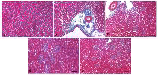 Masson trichrome staining. Masson’s trichrome staining was showing that (a): Normal kidney architecture showing no collagen deposition; (b): significant increase in collagen deposition in animals treated with STZ was noticed; (c): Following treatment with gingerol and STZ treated group collagen deposition was reduced as compared to the disease control group, (d): positive control (diabetic rats treated with glibenclamide) not showing any collagen deposition, (e): Gingerol-treated group only did not show deposition of collagen. (Scale bar = 100 µm).