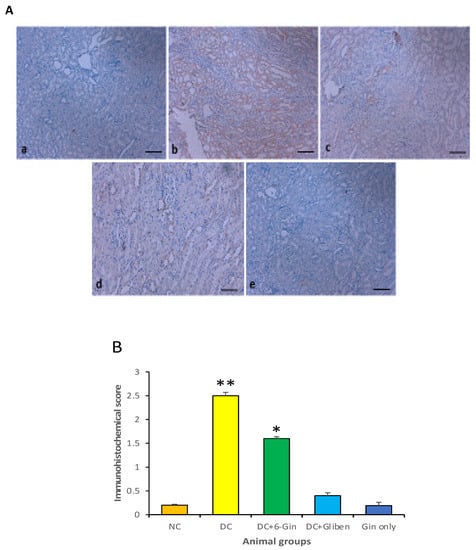 The expression of TNF-α protein was not noticed in kidneys of the control group while it showed intense expression in the diabetic control group as compared to the normal control group (p < 0.01). Moreover, diabetic groups treated with 6-gingerol, exhibited low expression in the diabetic group plus the 6-gingerol group as compared to the diabetic control group (p < 0.05). As a result of treatment of diabetic rats with 6-gingerol, showed a significant decrease TNF-α protein expression as compared with the diabetic group (Figure 8A,B).