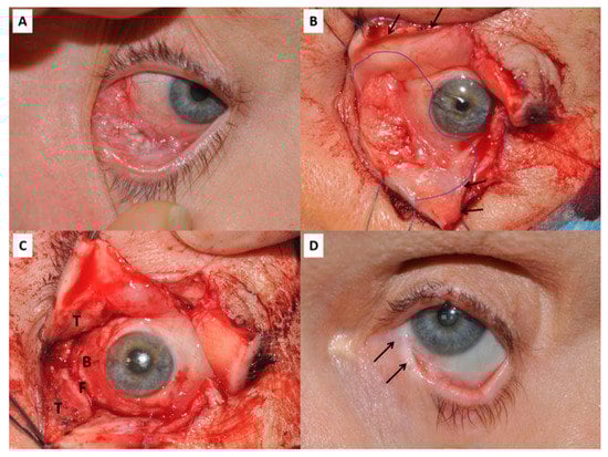 (A) Conjunctival squamous cell carcinoma affecting the infero-medial quadrant of the left eye. (B) Same patient during surgery. The upper and lower eyelids have undergone a full-thickness vertical lid-split procedure (arrows mark the cut edges) to improve visualisation and access to the tumour. The intended resection margin is shown by the curved line. (C) Following resection of the tumour there is an extensive conjunctival defect involving the tarsal plates and conjunctiva (T), the inferior fornix (F) and the bulbar conjunctiva (B). (D) Late post-operative image of the same patient showing symblepharon between the lower lid and globe (arrows), despite reconstruction with amniotic membrane, a free tarsal graft to the lower lid and temporary Gore-tex sheets as spacers.