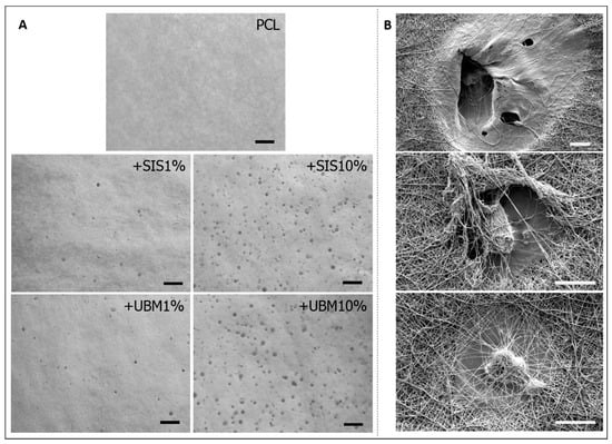 (A) Gross images of as-spun electrospun fibres for poly(ε-caprolactone) (PCL) and with the addition of 1% or 10% decellularised tissue powder (dECM—small intestinal submucosa (SIS) and urinary bladder matrix (UBM)) (scale = 5 mm). Images converted to greyscale for observation of ‘wet’ droplets on dECM containing fibre scaffolds. (B) Scanning electron microscopy images highlighting the ‘wet’ droplets present within the PCL + SIS10% fibres and the holes these create. Scale bar = 40 μm, magnification ×1000 (top image) and ×2000 (middle and bottom images).