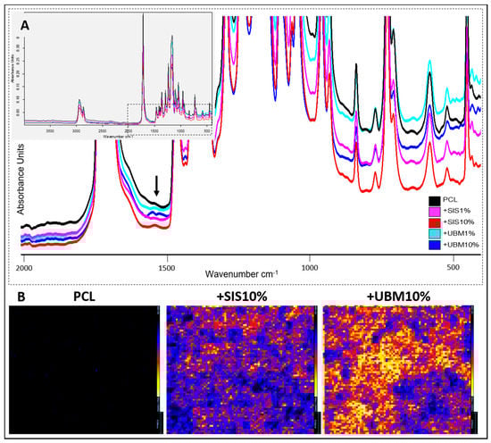 In order to detect the presence of decellularised tissue within the PCL fibres, FTIR and Imaging-Mass Spectrometry were performed. Comparison of the scaffolds’ complete spectra revealed no obvious differences (Figure 5A). Characteristic chemical bonds for esters were identified C=O (1750–1735 cm−1) and C–O (1260–1000 cm−1), in addition to C–H bonds (2960–2850 cm−1). Closer examination demonstrated a distinct peak within 1650–1590 cm−1 which was most apparent for PCL + SIS10% and PCL + UBM10%.