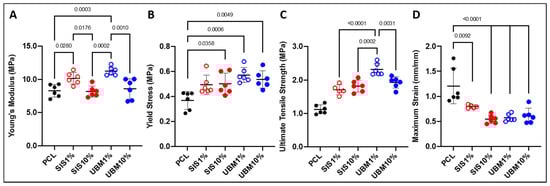 Tensile testing data for scaffolds of electrospun poly(ε-caprolactone) (PCL) and with the addition of 1% or 10% decellularised tissue powder (small intestinal submucosa (SIS) and urinary bladder matrix (UBM)): (A) Young’s modulus, (B) yield stress, (C) ultimate tensile strength and (D) maximum strain at break. One-way ANOVA with Tukey’s multiple comparisons (n = 6), significance for p < 0.05. Statistical differences shown by p values.