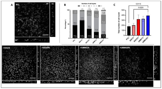 The response of human conjunctival epithelial cells (HCjE), in terms of their ability to stratify on the different scaffolds was investigated. HCjE cells were cultured on the scaffolds for a total of four weeks, where the final week was at the air/liquid interface. SEM imaging revealed a difference in cell response to the fibre scaffolds (Figure 7). Low magnification (×1000) images for the PCL scaffold revealed patches of electrospun fibres with limited presence of cells. In contrast, dECM-containing scaffolds demonstrated complete cell coverage over the fibre surface at the same magnification. HCjE cells on PCL-only scaffolds appeared well spread with flattened morphologies. In some regions, it was possible to view the shape of fibres situated beneath the cells. Cellular processes enabling cell-to-cell contact were evident. Indication of HCjE stratification on PCL fibres appeared limited. Observation through the z-plane of PCL scaffolds and DAPI-stained cell nuclei by confocal microscopy revealed occasions of two (40.47 ± 6.45%) and three (13.26 ± 6.03%) cell nuclei loosely-stacked on top of each other (Figure 8A,B). Single nuclei accounted for 46.37 ± 5.88% and the total number of nuclei (180 ± 28) counted from the six regions of interest (n = 3) was lowest on PCL scaffolds overall (Figure 8B,C). SEM images for dECM-containing scaffolds identified two main morphologies: small, rounded cells with multiple cellular processes, and larger, elongated cells with flattened appearances (Figure 7). These flattened cells appeared in greater numbers within the SIS1% cohort. A breakdown of cell layers for SIS1% from the total number of counted nuclei (202 ± 39) revealed single cells accounting for 63.86 ± 15.60%, two-layers 31.35 ± 13.13% and three stacked-nuclei occurring 4.79 ± 2.16%. A greater number of cell nuclei (321 ± 85) were counted in the SIS10% group, with observed instances of one, two, three and even four-layers from the regions of interest being 33.46 ± 17.95%, 46.91 ± 5.88%, 18.50 ± 11.33% and 1.13 ± 0.99%, respectively. UBM-containing groups supported superior stratification with greater instances of four and occasionally five layers of cell nuclei evident in the regions of interest. For UBM1% 329 ± 50 cell nuclei were counted, with 22.31 ± 5.08% being single nuclei, 51.44 ± 3.43% two nuclei, 22.82 ± 4.09% three nuclei and 3.43 ± 2.45% four-stacked nuclei. For UBM10%, from 392 ± 81 counted nuclei, 13.80 ± 10.52% were single, 37.02 ± 7.85% two-layers, 33.13 ± 9.07% three-layers, 13.48 ± 8.87% four-layers, and 2.57 ± 1.10% five-layers.