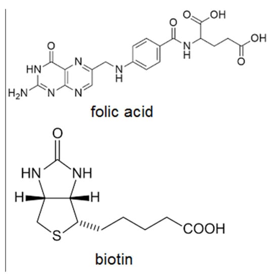 Biotin enhances the internalization of nanoscale drug delivery systems by the target cells/tissue while exerting a lesser effect on normal cells and thus, became one of the most attractive targeting moiety. Since biotin receptors—sodium dependent multivitamin transporters (SMVT)—are overexpressed on the cancer cell surface, they, in turn, became a target of biotin-functionalized DDSs [113]. This fact has been utilized as a new strategy of cancer therapy, diagnostic and theranostic, that combines both, therapy and diagnostic [114]. Many reports have confirmed that biotinylated drug vehicles increase selectivity and uptake of active agents in tumour cells when compared to non-biotinylated DDSs [115,116]. Moreover, enhancement of the cellular uptake of various drug carriers results in active recognition of biotin by the receptors, regardless of the type of DDS modification, so biotin may be covalently linked with a carrier or surface-attached. In addition, in some cancer cells such as colon, breast, lung, renal or ovarian, expression of SMVT is higher than other transporters e.g., folate receptors (FARs). These findings made the biotinylation a strategy of aggressive cancer targeting, especially those with SMVT but without FAR overexpression [117].