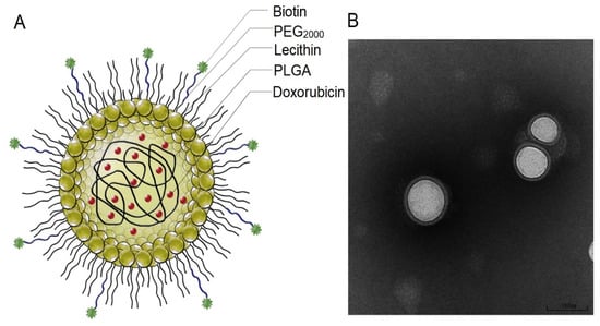 A schematic presentation (A) and TEM image at a scale = 100 nm (B) of DOX-PLGA-lecithin-PEG-biotin nanoparticles (B). With permission from Dai et al. [120].