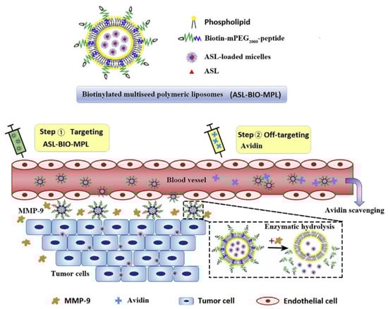 Multi-seed polymeric liposomes loaded with asulacrine (ASL-BIO-MPL) was prepared through encapsulating micelles as seeds in the aqueous phase of biotinylated polymeric liposomes using micelle gradient method [137]. The outer layer of such systems was modified with polymer-polypeptide, which is cleaved by matrix metalloproteinases-9 and attached with the tumour targeting agent. After reaching the target site, metalloproteinases-9 degraded cleavable peptides into short peptides causing the changes in liposomal membrane architecture. This resulted in the release of inner asulacrine, containing small micelles for deep intratumour distribution. In this study, a two-step method was used to scavenge the blood of ASL-BIO-MPL with the use of injected avidin employed to protect normal tissues from nanocarriers (Figure 6). The augment cell penetration and cytotoxicity of ASL-BIO-MPL in 3D tumour spheroids and tumour-bearing mice were confirmed [129]. In vivo safety experiments shown that targeted nanocarriers in the presence of avidin caused mild pathological changes in studied tissues such as heart, liver, spleen, lung and kidney. Nevertheless, the use of avidin may be considered controversial due to its origin, non-specific binding and possible immunogenicity [138].