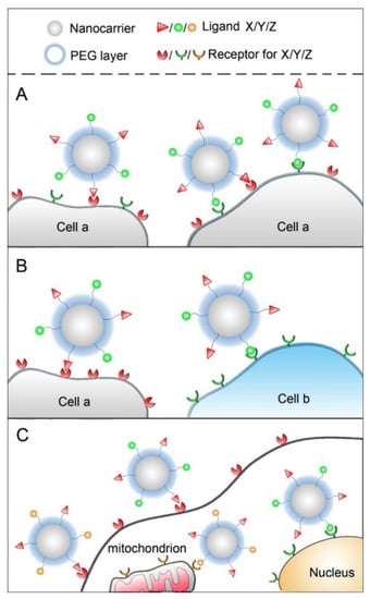 Scheme of three types of dual-molecular targeting: (A) dual-targeting nanocarriers target one kind of cell; (B) dual-targeting nanocarriers target simultaneously various cells; (C) Dual-targeting nanocarriers target cells that overexpress one kind of receptor on the cell and another kind of receptor inside cells on nuclei or mitochondria. With permission from Zhu et al. [6].