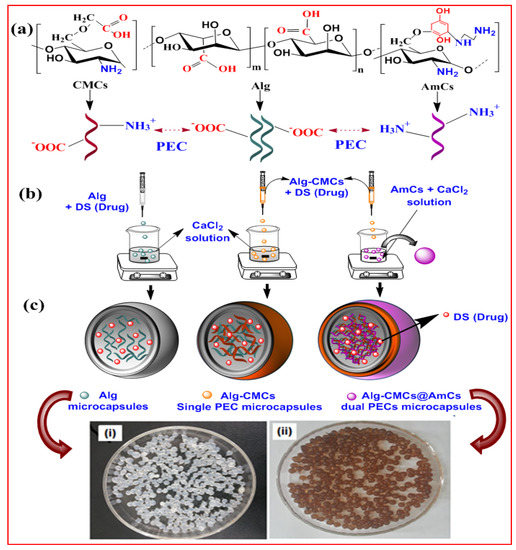 (a) proposed scheme for the polyelectrolyte complex formation between alginate (Alg), carboxymethyl chitosan (CMCs), and aminated chitosan (AmCs), (b) a schematic diagram for the formulation of diclofenac sodium (DS)-loaded Alg, Alg-CMCs, and Alg-CMCs@AmCs dual polyelectrolyte complexes (PECs) microcapsules and (c) digital laboratory image for freshly (i) Alg and (ii) Alg-CMCs@AmCs wet microcapsules.