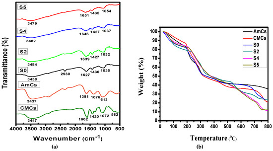 (a) FTIR spectra and (b) TGA thermograms of native AmCs, CMCs derivatives, Alg (S0), Alg-CMCs (S2), and Alg-CMCs@AmCs (S4 and S5) microcapsules.
