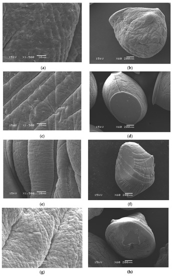 Through a visual check (Figure 1c), the freshly wet microcapsules were practically spherical with an average diameter approximately of 2.711 ± 0.010–3.891 ± 0.005 mm. Conversely, an extensive decrease in the diameter after drying was noticed and recorded maximum values in the range of 0.484 ± 0.071–0.562 ± 0.090 mm. Moreover, Table 1 clarified that the diameter of wet Alg-CMCs single PEC microcapsules decreased after coating with the AmCs layer as a result of the network shrinking in the acidic conditions. Besides, the topographical properties of microcapsules were examined by a scanning electron microscope (SEM), and the images are depicted in Figure 3. The SEM images of the whole surface indicated that all examined dried microcapsules samples were not completely spherical and constituted polyhedral shapes. Although the drying process of wet microcapsules had been accomplished under mild conditions (i.e., room temperature), the loss of water significantly changed their spherical form. The observed shape deformation is predictable due to the hydrophilic nature of the developed hydrogel microcapsules. In addition, water loss during the dehydration process leads to contraction and collapsing of microcapsules networks. These observations agreed with those obtained by other reports [18,48]. Obviously, the surface of whole Alg microcapsules exhibited a cracking surface with some wrinkles and cavities [49]. Although it became more compact and dense in case of Alg-CMCs due to the generated electrostatic interactions between positively and negatively charged groups resulting in single PEC.