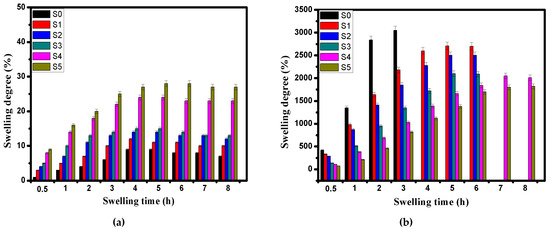 Definitely, the swelling characteristic is one of the utmost imperative features of the drug carriers-based biopolymers, which directly affects the liquid penetration and the drug release rates. Factually, the swelling phenomenon involves the hydration of the present hydrophilic groups in the microcapsules matrix [51]. The rigid pores among the hydrogel network are filled with the penetrated water molecules from the outer medium, and the swelling occurs accordingly.