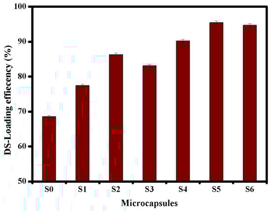 To accomplish the anticipated therapeutic effect of the drug dosage, the oral drug carriers require substantial encapsulation efficiency without obstructing the biological action of drugs. The main objective of this study is to improve the drug encapsulation efficiency of microcapsules-based alginate. Figure 5, revealed that Alg microcapsules (S0) recorded the lowest loading value of 68.6% due to their high porosity. The DS-loading efficiency was greatly improved after the formation of single PEC, since it increased with increasing CMCs ratio and reached a maximum value of 86.3% using Alg-CMCs (1:1) single PEC microcapsules. In addition, Alg:CMCs@AmCs dual PECs microcapsules (S4, S5 and S6) displayed the highest values compared to those obtained by neat Alg and Alg:CMCs single. The DS-loading efficiency was increased from 90.23 to 95.45% with increasing AmCS concentration from 0.25% (S4) to 0.5% (S5) as a result of increasing viscosity of the gelling medium (CaCl2/AmCs). Furthermore, increasing AmCs concentration would generate more electrostatic attractions between the free positively charged NH2 groups on the surface of microcapsules and the negatively charged DS-molecules. These in turn prevent the leakage of DS molecules through the formulation of coated microcapsules. In contrast, raising the AmCs concentration in the gelling medium from up to 1% would produce a highly viscous solution that adversely affects the dispersion of DS-molecules through the microcapsules matrix, resulting in a slight decrease in the encapsulation efficiency. A comparison of the obtained DS-loading efficiencies with those obtained by other reported studies using carriers-based alginate biopolymer is presented in Table 3 [54,55,56,57,58,59,60]. The results clarified that the developed single and dual PECs microcapsules exhibited better loading efficiencies, confirming the successful formulation process.