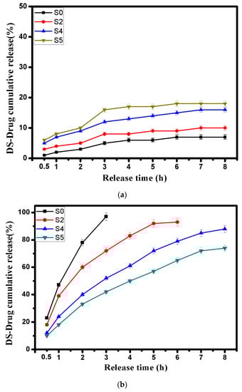 Indeed, the drug release mechanism is mostly controlled by the network swelling of the hydrogel microcapsules at the initial stage. The release profiles of DS-drug were investigated in simulated gastric fluid (SGF; pH 1.2) and simulated colonic fluid (SCF; pH 7.4) as shown in Figure 6a,b. The results portrayed that pH-sensitivity of alginate, carboxylated chitosan and aminated chitosan can be exploited to customize the DS-drug release profiles. By comparing the drug release profiles, it was evident that the drug release (%) in SGF (pH 1.2) was by far lower than that of SCF (pH 7.4), which complies with the swelling profiles at the same pH as mentioned previously. The results revealed that both of Alg and Alg-CMCs did not show a significant DS-drug release in SGF pH 1.2 microcapsules, since maximum release values did not exceed 7 and 10% after 8 h for Alg and Alg-CMCs microcapsules, respectively. The limited drug release in SGF could be a result of lower swelling degrees of tested microcapsules at the same pH 1.2. In addition, the stable structure of both Alg and Alg-CMC single PEC microcapsules would prevent the swelling of hydrogel networks and consequently obstruct the DS- drug release in SGF. However, a slight increase in the drug release (%) was noticed in case of Alg-CMC@AmCs dual PECs microcapsules (S4 and S5) due to protonation of some free NH2 groups in the outer layer. This in turn, facilitates the solution diffusion [61], and DS-drug would be released accordingly.