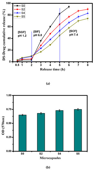 The in vitro drug release experiments were conducted in a shaking water bath (50 rpm) at 37 °C. Briefly, 100 mg of DS- loaded microcapsules samples were immersed individually in 10 mL of simulated gastric fluid (SGF; pH 1.2) and simulated colonic fluid (SCF; pH 7.4), which were prepared using fresh buffer solutions. Approximately, one mL of the release medium was removed for assaying after preset time intervals (0.5–8 h) and replaced with a fresh buffer medium with the same pH value, and followed with a simple filtration. A calibration curve of known DS-drug concentrations was performed, and the cumulative released quantity of DS-drug was detected by a UV-spectrophotometer at 276 nm according to the following Equation (2):
