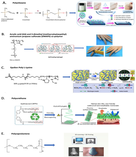 Examples of synthetic polymer formulation strategies: (A) Polysiloxane-based formulation for second skin [125,127]; (B) Acrylic acid (AA) and 3-dimethyl (methacryloyloxyethyl) ammonium propane sulfonate (DMAPS) co-polymer-based self-healing hydrogel [135]; (C) Epsilon Poly l-Lysine-based self-healing hydrogel [136]; (D) Polyurethane (with short perfluorobutyl chain) waterproof and breathable membrane [137]; (E) Polycaprolactone-based skin-conformable 3D-printed wound dressing [138].