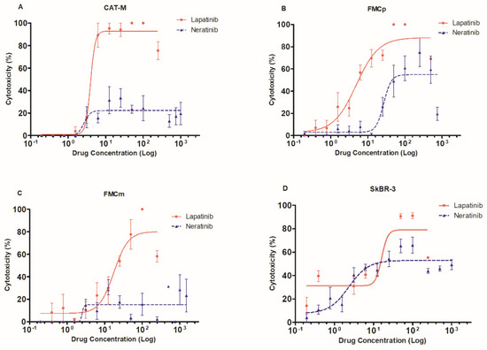 Lapatinib and neratinib showed strong cytotoxic effects in feline mammary carcinoma cell lines. (A) CAT-M cell line presented higher cytotoxic effects when incubated with lapatinib (IC50 = 3930 nM ± 49) than with neratinib. (B) FMCp cell line was susceptible to both lapatinib and neratinib (100% and 74.9% of cytotoxicity, respectively; IC50 = 4870 nM ± 100 for lapatinib). (C) FMCm cell line also showed high cytotoxic effects in the presence of lapatinib (IC50 = 17,470 nM ± 100), contrasting with the neratinib. (D) SkBR-3 cells showed a maximum cytotoxic effect of 91.1% (IC50 = 16,220 nM ± 1040) after exposure to lapatinib and 66.0% when exposed to neratinib. For graphical convenience, lapatinib was represented in a µM range, while neratinib was defined in a nM range. The experiments were performed in triplicates, in three independent assays.