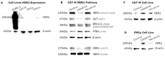 Feline mammary carcinoma is usually diagnosed belatedly, presenting an aggressive behavior, with the FMC HER2-positive showing a poor prognosis [3,8,35]. Therefore, an early detection and an effective therapy is crucial, in order to improve survival time in cats with mammary tumors. Thus, in this study, the antiproliferative effects of two TKi (lapatinib and neratinib) were evaluated using three FMC cell lines (CAT-M, FMCp and FMCm), with different HER2 expression levels and no mutations described as possibly conducing to resistance to therapy (Table S3). Moreover, the obtained results were compared to a human HER2-overexpressing breast cancer cell line (SkBR-3).