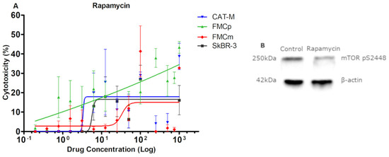 The use of rapamycin as a single drug did not presented a valuable antiproliferative effect (Figure 3A). Accordingly, the CAT-M and FMCm cell lines showed 38.7% and 41.3% of cytotoxicity, respectively, with the FMCp showing slightly more sensitivity to rapamycin (43.3% of cytotoxicity). Similar results were obtained with the control SkBR-3 cell line (26.9% of cytotoxicity). Additionally, the immunoblot analysis revealed a decrease in the mTOR phosphorylation levels after rapamycin exposure (Figure 3B).