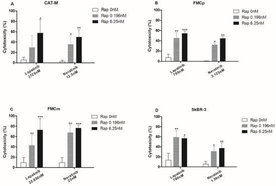 Combinations of TKi and mTOR inhibitor (lapatinib plus rapamycin and neratinib plus rapamycin) showed synergistic antiproliferative effects in feline mammary tumor cell lines. (A) CAT-M cells presented a significantly higher antiproliferative response when exposed to lapatinib at 3125 nM plus rapamycin at 6.25 nM or incubated with neratinib at 12.5 nM plus rapamycin at 6.25 nM (57.5% of cytotoxicity, * p < 0.05; 49.9% of cytotoxicity, ** p < 0.01, respectively). (B) FMCp cells showed significant synergistic effects of conjugations between lapatinib at 780 nM plus rapamycin at 0.196 nM or at 6.25 nM (45.5% of cytotoxicity, ** p < 0.01; 54.4% of cytotoxicity, *** p < 0.001, respectively), and when neratinib at 3.125 nM plus rapamycin at 0.196 nM or at 6.25 nM were used (32.1% of cytotoxicity, * p < 0.05; 44.5% of cytotoxicity, ** p < 0.01, respectively). (C) FMCm cells presented an increased cytotoxic response to the conjugations of lapatinib at 22,650 nM plus rapamycin at 0.196 nM or at 6.25 nM (42.6% of cytotoxicity, ** p < 0.01; 95.2% of cytotoxicity, *** p < 0.001, respectively) and neratinib at 25 nM plus rapamycin at 0.196 nM or at 6.25 nM (67.7% of cytotoxicity, ** p < 0.01; 76.3% of cytotoxicity, *** p < 0.001, respectively). (D) SkBR-3 cells used as control, displayed similar antiproliferative responses to feline cell lines. All the assays were performed in triplicate and repeated a total of three separated times.