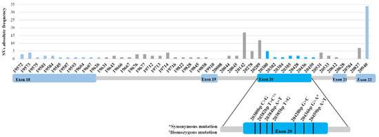 Previous studies on somatic mutations in the TK domain of the her2 gene, in human breast cancer patients, revealed several mutations associated with therapy resistance to TKi and/or specific clinicopathological features, reported in National Cancer Institute database, International Cancer Genome Consortium and COSMIC databases. In this work, the mutational analysis of the feline her2 TK domain, showed that mutations occur in the majority of tumor samples (90%, 36/40), being identified a total of 42 single variants (SVs) (Figure 5), located in introns (54.8%; 23/42) and exons (45.2%; 19/42) (Table S2). Regarding the intronic SVs, 21.7% (5/23) were found in splicing regions (c.19631 and c.19643; c.20278 and c.20289; c.20612), with the majority detected between exons 18 and 19 (60.9%; 14/23). Further sequence analysis revealed that exons 18 and 20 showed a higher number of mutations (57.9%, 11/19 and 36.8%, 7/19, respectively), contrasting with the exon 22 that has only one mutation with a very high frequency (85%; 34/40; c.20940 T > G) and with exons 19 and 21 where no mutations were detected. Finally, when tumor samples were divided into four molecular subtypes, 71.4% of the triple-negative tumors (5/7), 58.3% of the HER2-positive (7/12) and 55.6% of the luminal B (10/18) showed at least one mutation. No mutations were detected in luminal A tumors (0/3).