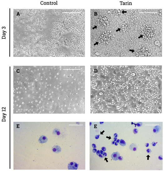 BM cell cultures were challenged on day 0 with a single tarin dose ranging from 6 to 100 μg/mL followed by culturing for 12 days. The number of discrete aggregates (3–50 cells scored as clusters and 50 or more cells scored as colonies) were counted in distinct fields at different timepoints. Cell densities were calculated as the percentage of occupied area/field using the ImageJ software version 2 (Wayne Rasband, Bethesda, MD, USA) [32]. Photomicrographs were obtained using an inverted-phase Zeiss Telaval microscope (model 31) (Carl Zeiss Co., Oberkochen, Germany). On the last day of culture, cells were harvested using sterile cell scrapers and transferred to glass slides by centrifugation at 284× g for 10 min, at room temperature, using a Cytopro 7620 centrifuge (WESCOR Inc., Logan, UT, USA). Cells were then stained following the May-Grunwald-Giemsa method [33,34], and photomicrographs of the cultures were acquired under a n optical microscope (Olympus BX41) using the Future WinJoe v1.0.7.9 software (Future Optics Sci. & Tech. Co, Xiasha, Hangzhou, China).