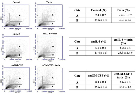 A highly enriched conditioned medium containing IL-3 increased the cell percentage (5.5% ± 0.8) in gate A, similar to the observed in the combined cmIL-3 + tarin treatment (6.2% ± 0.4). The percentage of cells in gate B increased upon cmIL-3 stimulation (41.4% ± 1.5) compared to the control (34.6% ± 1.4) or tarin (30.3% ± 2.0). However, the combination of tarin and cmIL-3 decreased the percentage (28.3% ± 2.4) in gate B when compared to the cmIL-3-treated and control cultures (34.6 ± 1.4%) (Figure 3, right panel), but similar to tarin alone.