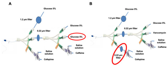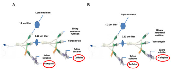 Infusion line used in the neonatal intensive care unit. CEF infusion line with cefepime placed on the unfiltered emergency track (A); CAF infusion line with caffeine placed on the unfiltered emergency route (B).