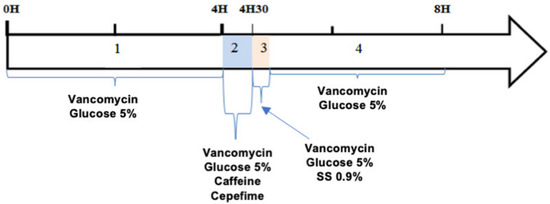 Infusion protocol adapted in vitro to the laboratory. 4 periods: (1) period T0 to T4H: Perfusion of vancomycin and G5%; (2) period T4H to T4H30: Perfusion of vancomycin, cefepime, caffeine and G5%; (3) T4H30-T4H41: Perfusion of vancomycin, G5% and rinsing with saline solution of the cefepime and caffeine routes; (4) period T4H41 to T8H: Perfusion of vancomycin and G5%.