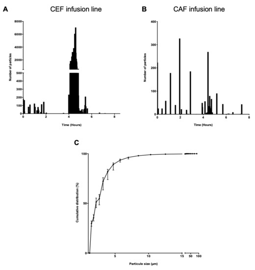 A difference in particulate load during the 8-h infusion was observed between the two assembly lines. A peak was visible during the simultaneous infusion of cefepime, caffeine and vancomycin with the CEF infusion line (Figure 5A,B).