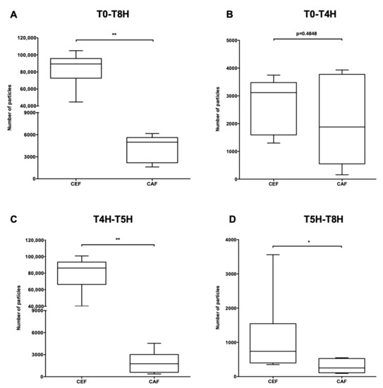 Over the period T0 to T4H, no significant difference in particulate load was observed between the CEF and CAF assembly lines (p = 0.4848) (Figure 6B) whereas a significant difference was noted during the period T4H to T5H (p < 0.01) (Figure 6C) as well as during the third period (p < 0.05) (Figure 6D).