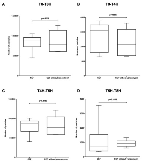 The total particulate load of the CEF infusion line without vancomycin (Figure 4A) was compared to that of the CEF infusion line with vancomycin (Figure 2A). No significant difference in particulate load was observed between them during the total infusion time (p = 0.9307) (Figure 7A) nor at periods T0-T4H, T4H-T5H and T5H-T8H (p = 0.5887, p = 0.8182 and p = 0.2403) (Figure 7B–D). The absence of vancomycin did not statistically affect particulate load.