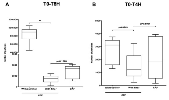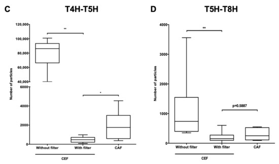 During the total duration of the infusion, the presence of a filter on the so-called emergency route of the CEF infusion line significantly reduced particulate load (p < 0.01) (Figure 8A). The same significant difference was to be noted during the period T4H-T5H (p < 0.01) (Figure 8C). Over the same period, particulate load was lower with the filter than with the CAF infusion line (p < 0.05) and during the period T5H-T8H the difference was significant between the CEF infusion line without filter and the CEF infusion line with filter (p < 0.01), regardless of particle size (Tables S5 and S6). However, during the periods T0-T4H (p = 0.0649 and p = 0.6991) (Figure 8B,D), the presence of the filter made no significant difference.