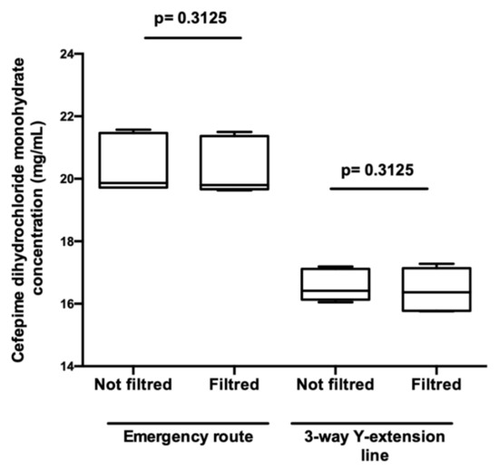 The presence of filters had no significant effect on the concentration of cefepime dihydrochloride monohydrate (p = 0.3125) (Figure 9).
