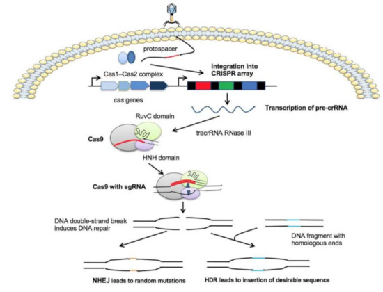 Molecular mechanism of the CRISPR-Cas 9 system. CRISPR-Cas systems are composed of a cas operon (blue arrows) and a CRISPR array which identical repeat sequences (black rectangles) that are interspersed by phage-derived spacers (colored rectangles). Upon phage infection, a sequence of the invading DNA (protospacer) is incorporated into the CRISPR array by the Cas1-Cas2 complex. The CRISPR array is then transcribed into a long precursor CRISPR RNA (pre-crRNA). In the CRISPR-Cas9 system, crRNA maturation requires tracrRNA, RNase III, and Cas9. The Cas9 protein contains two nuclease domains, the RuvC domain, and the HNH domain. Cas9 is guided by a sgRNA to induce a double-strand DNA break at a desired genomic locus. The sgRNA is composed of tracrRNA and crRNA. The tracrRNA hybridizes to the crRNA and binds to the Cas9 protein, forming the CRISPR-CAs9/sgRNA complex to edit genome sequences. DNA damage can be repaired by nonhomologous end joining (NHEJ), yielding short random insertions or deletions at the target site. Alternatively, a DNA sequence that shows partial complementarity to the target site can be inserted during homology-directed repair (HDR) for precise genome editing purposes.
