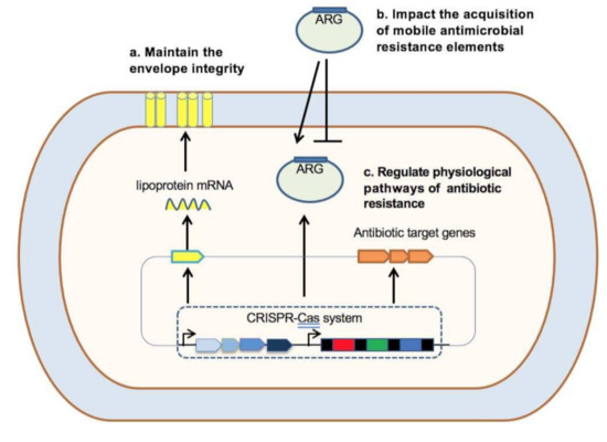 There are several studies indicate that the CRISPR-Cas system is associated with antibiotic resistance (Figure 2). For example, the Type I-F CRISPR system in E. coli was found associated with antibiotic susceptibility [35]. The CRISPR-Cas system in Francisella novicida maintains envelope integrity by regulating envelope lipoprotein expression to enhance antibiotic resistance [36]. The CRISPR-Cas system in Campylobacter jejuni was found involved in enhancing antibiotic resistance, as the deletion of the cas9 gene increased the sensitivity to antibiotics [37]. The findings of different studies reveal that the CRISPR-Cas system confers the competitive advantage over other variants for a population of bacteria that can acquire resistance genes [29]. In addition, the presence of the CRISPR-Cas system was correlated with the acquisition of antibiotic-resistant genes (ARGs), which can be positive or negative [38]: CRISPR-Cas-mediated immunity provides protection against foreign nucleic acids as well as the ARGs transfer. However, under a strong selective pressure imposed by antibiotics, the CRISPR-Cas system may be lost or devoid of function as they impede the acquisition of ARGs by horizontal gene transfer (HGT) [39].