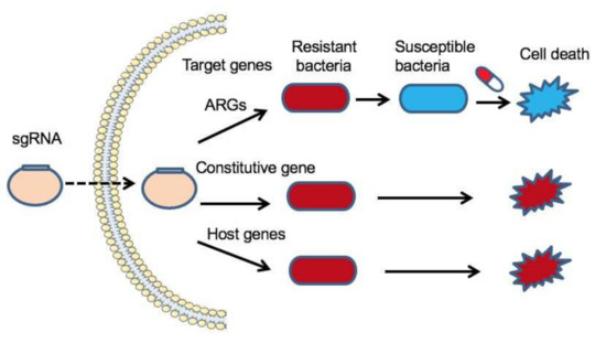 CRISPR-Cas system-based genome editing to combat bacterial infection. When the target genes are ARGs, the CRISPR-Cas system can restore the sensitivity of bacteria to antibiotics, and then the drugs will kill the susceptible bacteria. When the target genes are constitutive genes of the specific resistant bacteria, then the resistant bacteria will be killed. When the target genes are host chromosomal DNA that is cytotoxic to the resistant bacteria, the target cell will die because of the excision of the genome.
