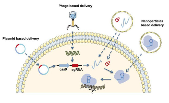 Encoded Cas9 mRNA delivery can overcome these drawbacks and be directly translated in the cytoplasm without entering the nucleus, resulting in reduced off-target effects and less risk of integration into the genome. However, mRNA is unstable and easily degraded by RNases either during the synthesis or when applied in vivo. Cas9-guide RNA ribonucleoprotein (RNP) complex delivery is the most straightforward and rapid approach for gene editing and has fewer off-target effects as well as low immunogenicity [94]. However, it is also the most challenging approach because of the large size of the Cas9 protein, the super negative charges of guide RNA, and the vulnerability to degradation and denaturation of RNPs during the entire process [95,96,97]. The development of stable and reliable nanoparticles for RNP delivery systems remains elusive. Plasmids or viral vectors, such as species-specific phages and adeno-associated viruses, are exploited for CRISPR-Cas delivery [98,99]. However, both methods are limited in practical use because of their low loading and packaging efficiency, narrow host range, risk of carcinogenesis, and immunogenicity.